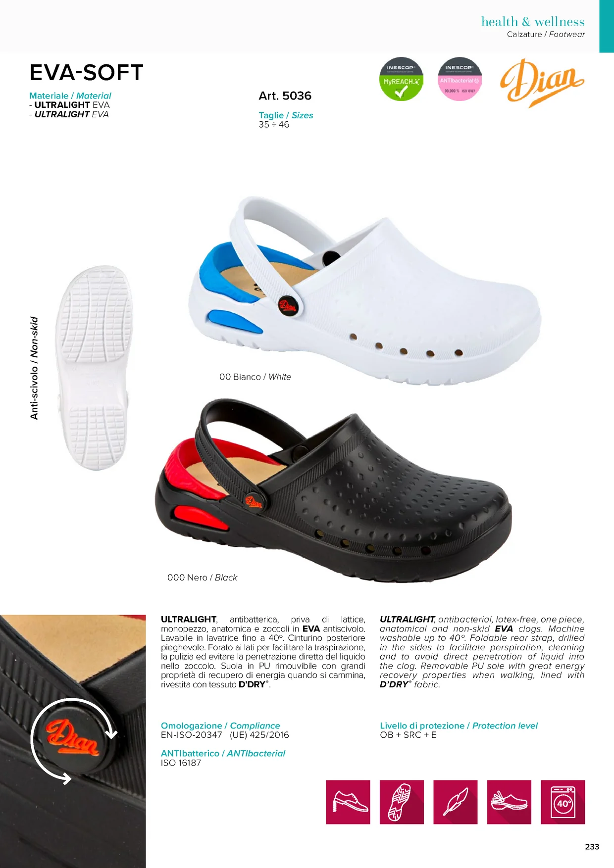 monopezzo, anatomica e zoccoli in EVA antiscivolo. anatomical and non-skid EVA clogs. Machine