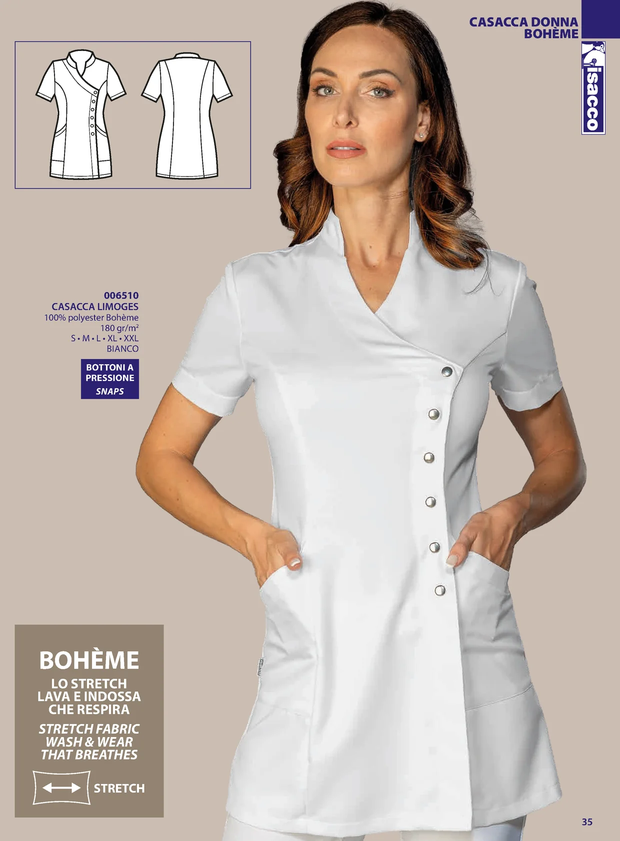 CASACCA DONNA BOHÈME 006510 CASACCA LIMOGES 100% polyester Bohème 180 gr/m2 S • M • L • XL • XXL BIANCO BOTTONI A PRESSIONE SNAPS BOHÈME LO STRETCH LAVA E INDOSSA CHE RESPIRA STRETCH FABRIC WASH & WEAR THAT BREATHES STRETCH 35