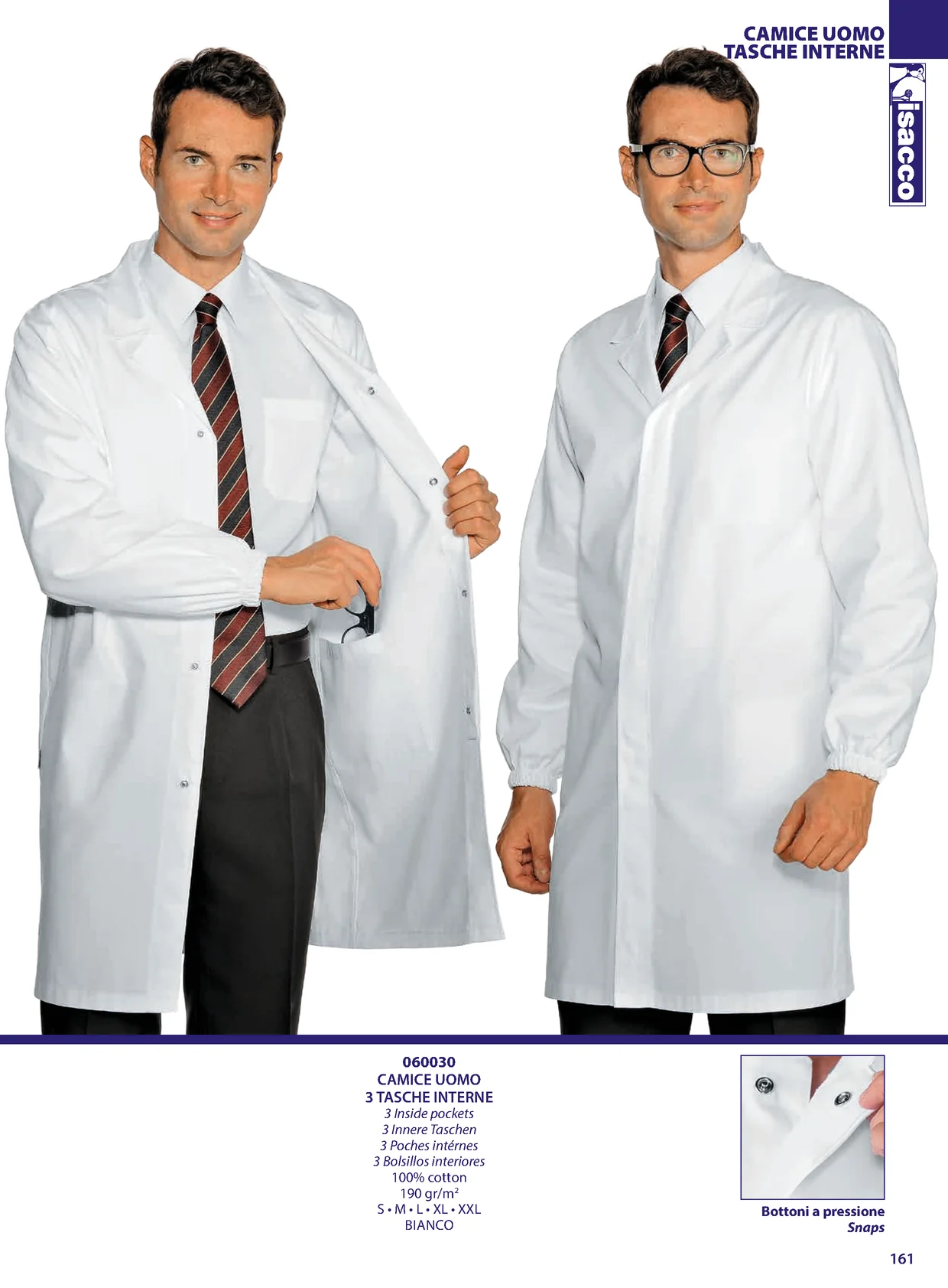CAMICE UOMO TASCHE INTERNE 060030 CAMICE UOMO 3 TASCHE INTERNE 3 Inside pockets 3 Innere Taschen 3 Poches intérnes 3 Bolsillos interiores 100% cotton 190 gr/m2 S • M • L • XL • XXL Bottoni a pressione BIANCO Snaps 161