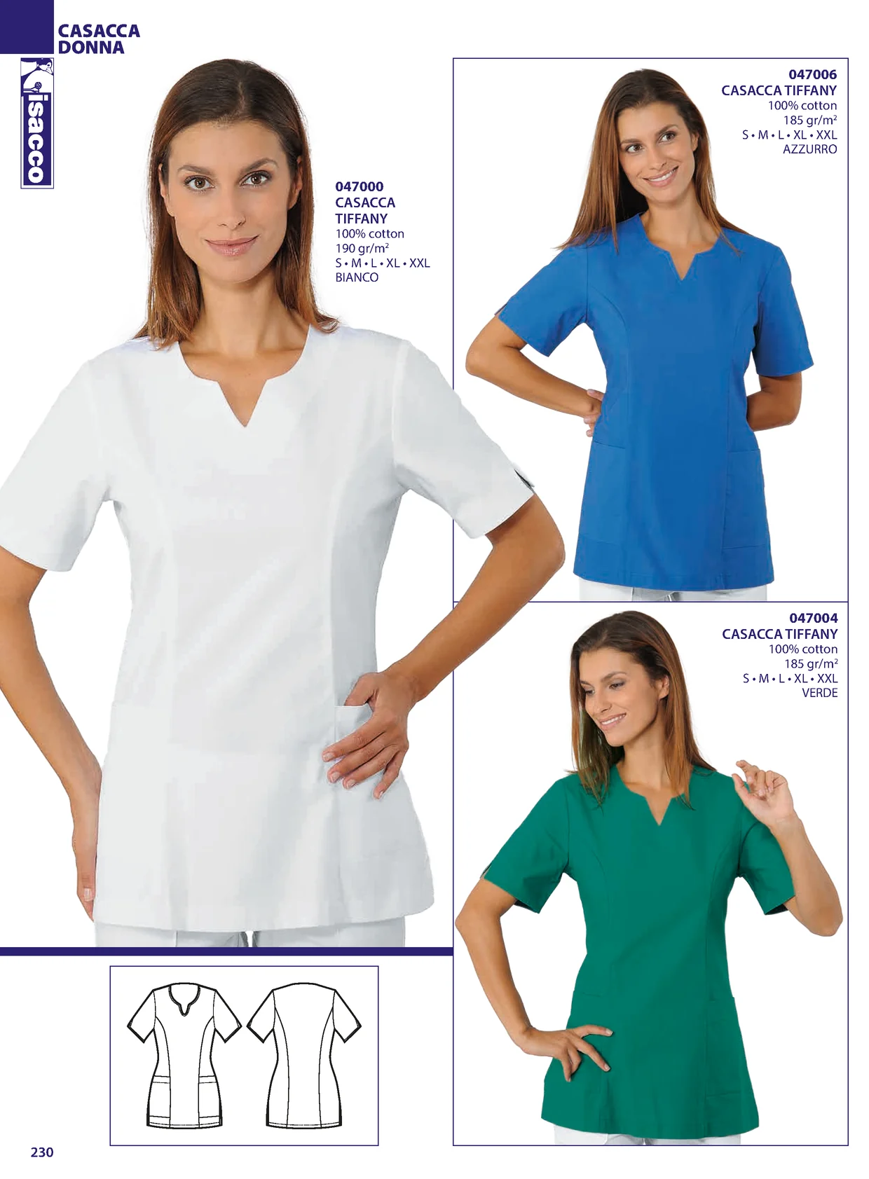 CASACCA DONNA 047006 CASACCA TIFFANY 100% cotton 185 gr/m2 S • M • L • XL • XXL AZZURRO 047000 CASACCA TIFFANY 100% cotton 190 gr/m2 S • M • L • XL • XXL BIANCO 047004 CASACCA TIFFANY 100% cotton 185 gr/m2 S • M • L • XL • XXL VERDE 230