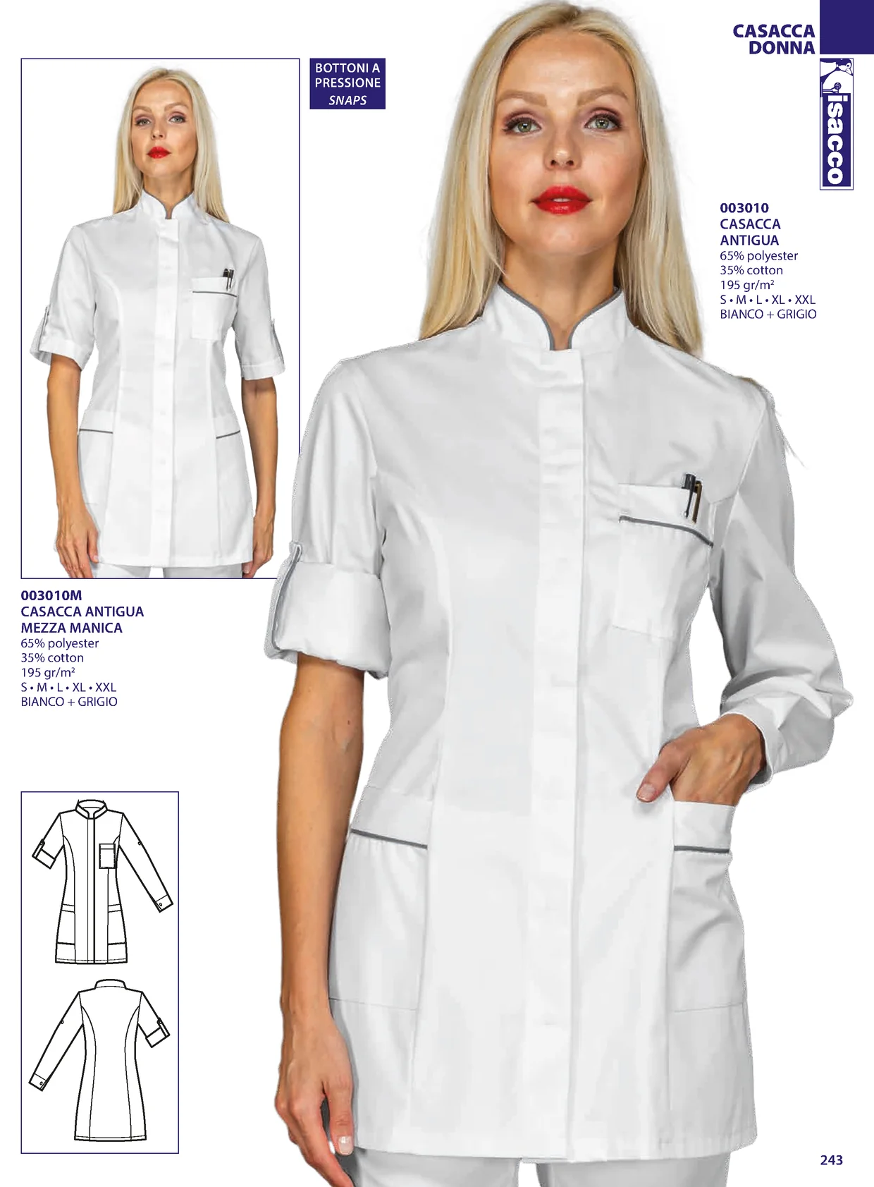 CASACCA DONNA BOTTONI A PRESSIONE SNAPS 003010 CASACCA ANTIGUA 65% polyester 35% cotton 195 gr/m2 S • M • L • XL • XXL BIANCO + GRIGIO 003010M CASACCA ANTIGUA MEZZA MANICA 65% polyester 35% cotton 195 gr/m2 S • M • L • XL • XXL BIANCO + GRIGIO 243