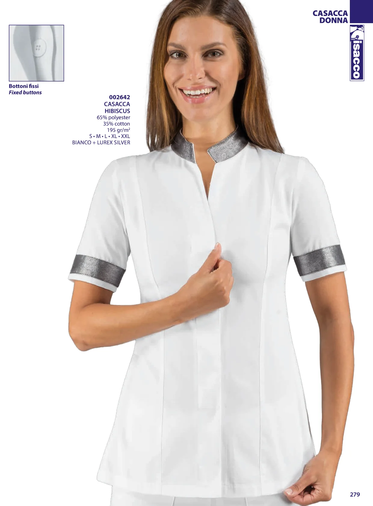 CASACCA DONNA Bottoni fissi Fixed buttons 002642 CASACCA HIBISCUS 65% polyester 35% cotton 195 gr/m2 S • M • L • XL • XXL BIANCO + LUREX SILVER 279