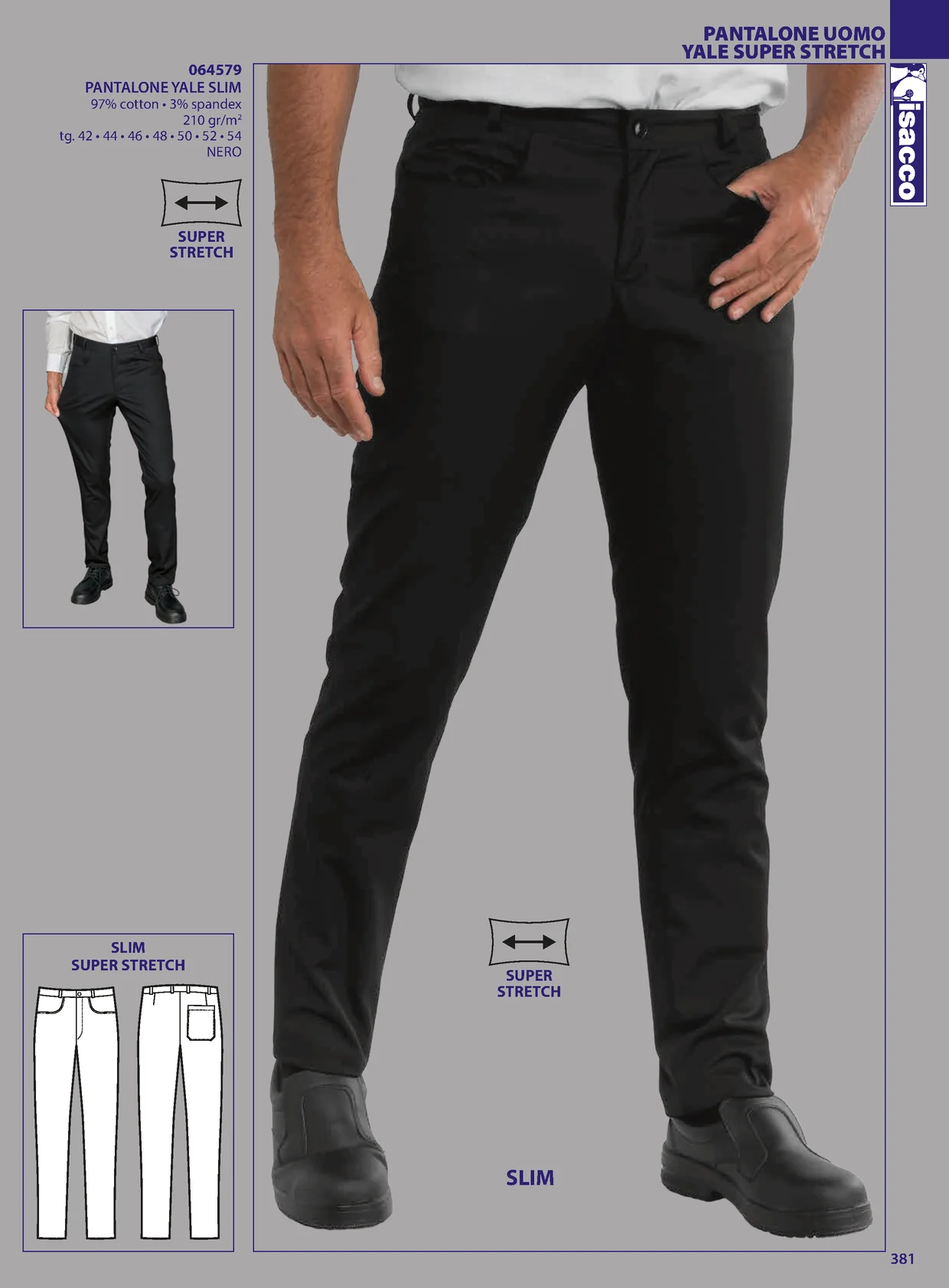 PANTALONE UOMO YALE SUPER STRETCH 064579 PANTALONE YALE SLIM 97% cotton • 3% spandex 210 gr/m2 tg. 42 • 44 • 46 • 48 • 50 • 52 • 54 NERO SUPER STRETCH SLIM SUPER STRETCH SUPER STRETCH SLIM 381