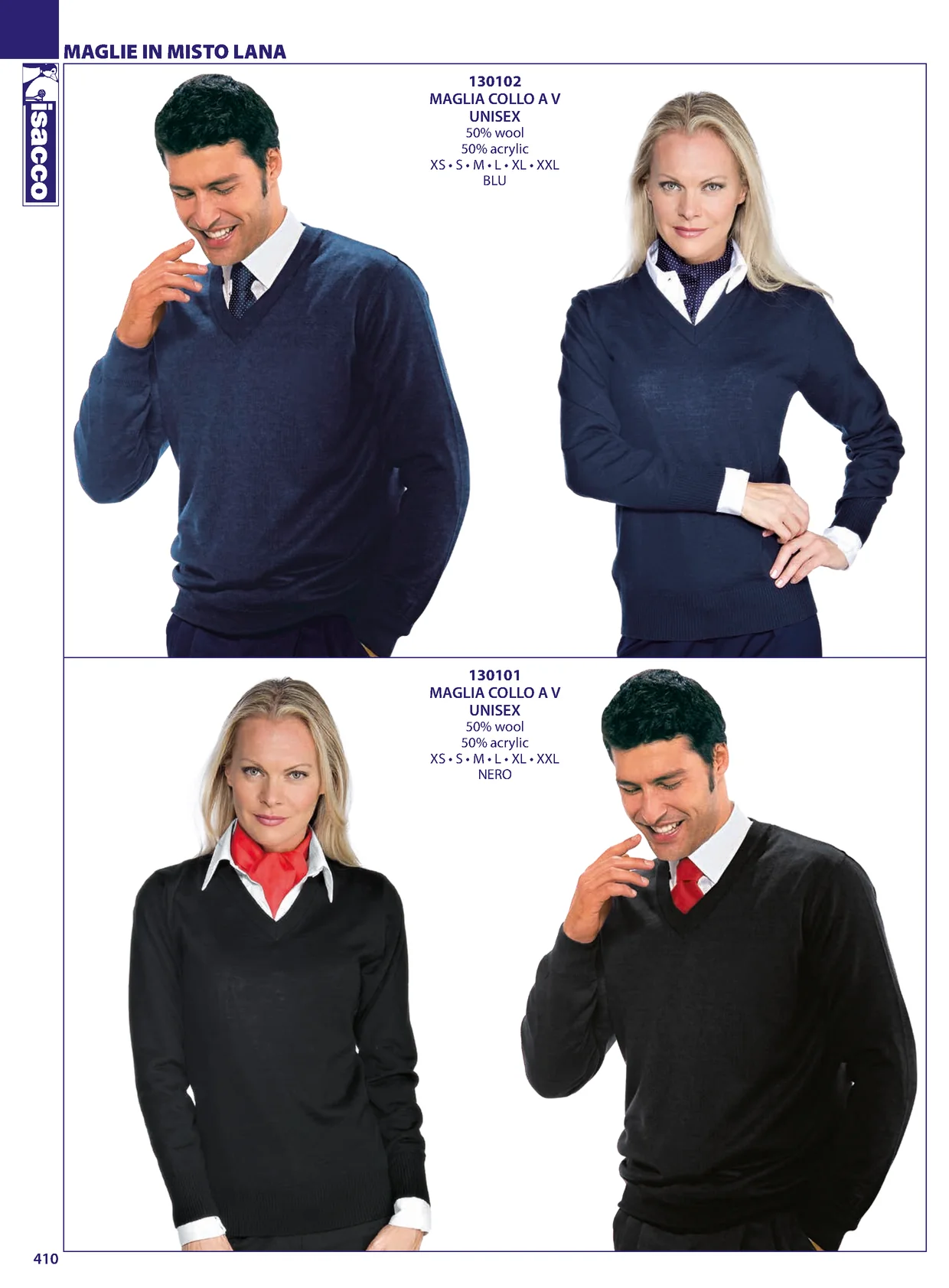 MAGLIE IN MISTO LANA 130102 MAGLIA COLLO A V UNISEX 50% wool 50% acrylic XS • S • M • L • XL • XXL BLU 130101 MAGLIA COLLO A V UNISEX 50% wool 50% acrylic XS • S • M • L • XL • XXL NERO 410