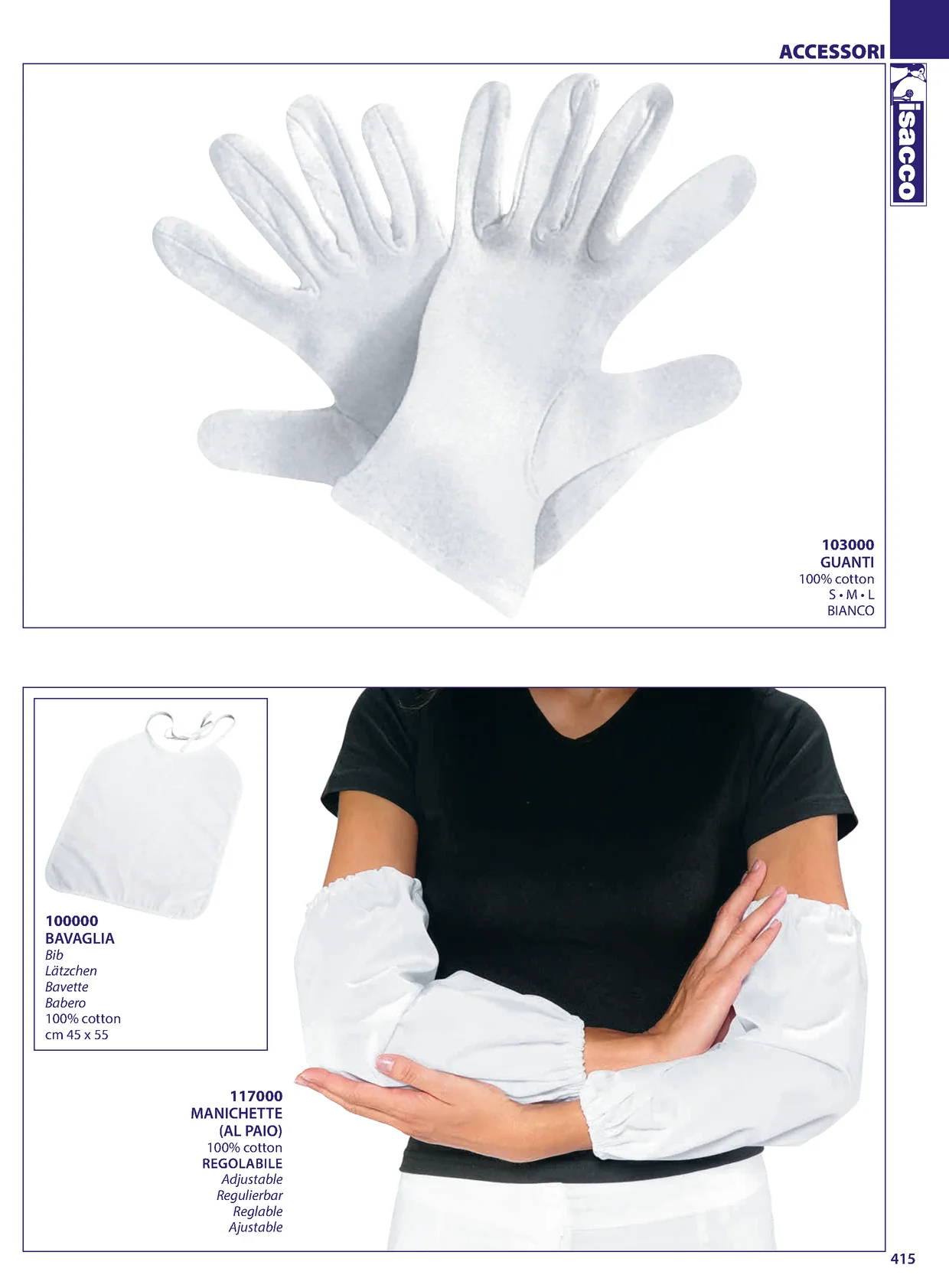 ACCESSORI 103000 GUANTI 100% cotton S•M•L BIANCO 100000 BAVAGLIA Bib Lätzchen Bavette Babero 100% cotton cm 45 x 55 117000 MANICHETTE (AL PAIO) 100% cotton REGOLABILE Adjustable Regulierbar Reglable Ajustable 415
