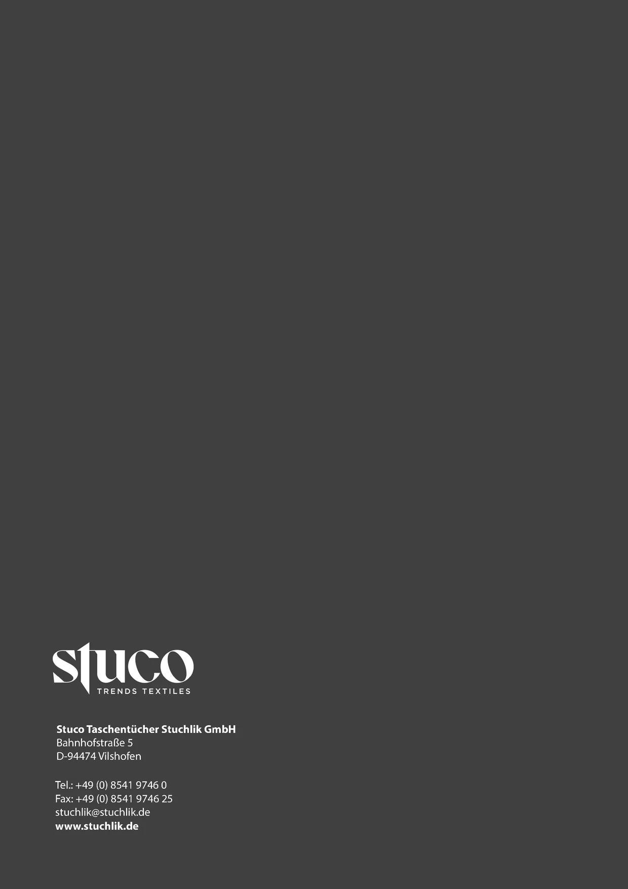 Stuco Taschentücher Stuchlik GmbH Bahnhofstraße 5 D-94474 Vilshofen Tel.: +49 (0) 8541 9746 0 Fax: +49 (0) 8541 9746 25 stuchlik@stuchlik.de www.stuchlik.de